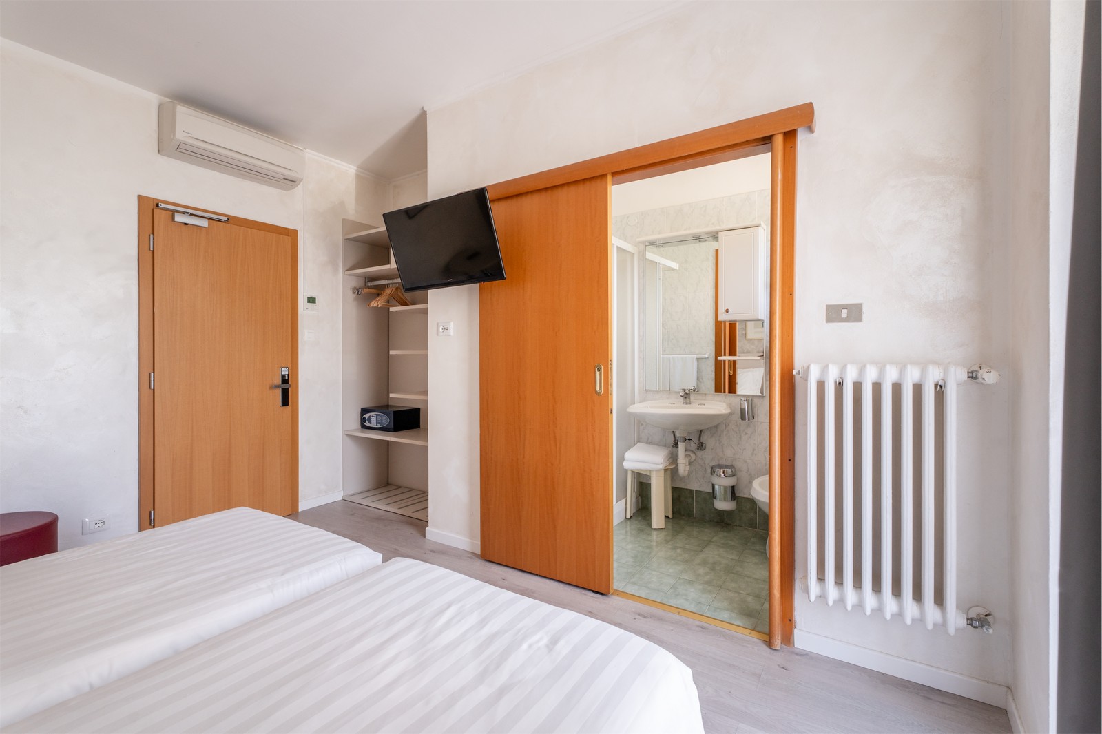 Camera al primo piano, esposta a sud, con letto matrimoniale o due singoli, bagno interno e balcone privato.