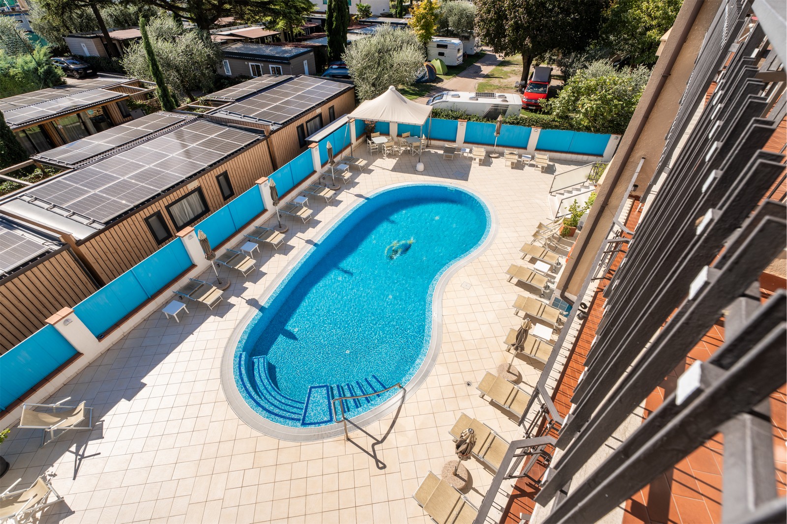 Letto matrimoniale/doppio + letto a castello, vista piscina, bagno interno e balcone privato.